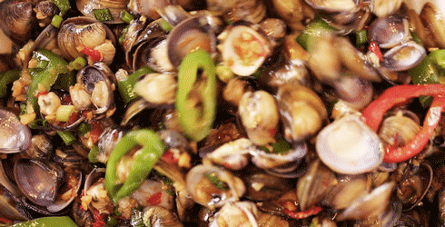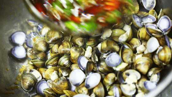 酱料调好后与灼熟的河蚬混在一起快速搅拌均匀