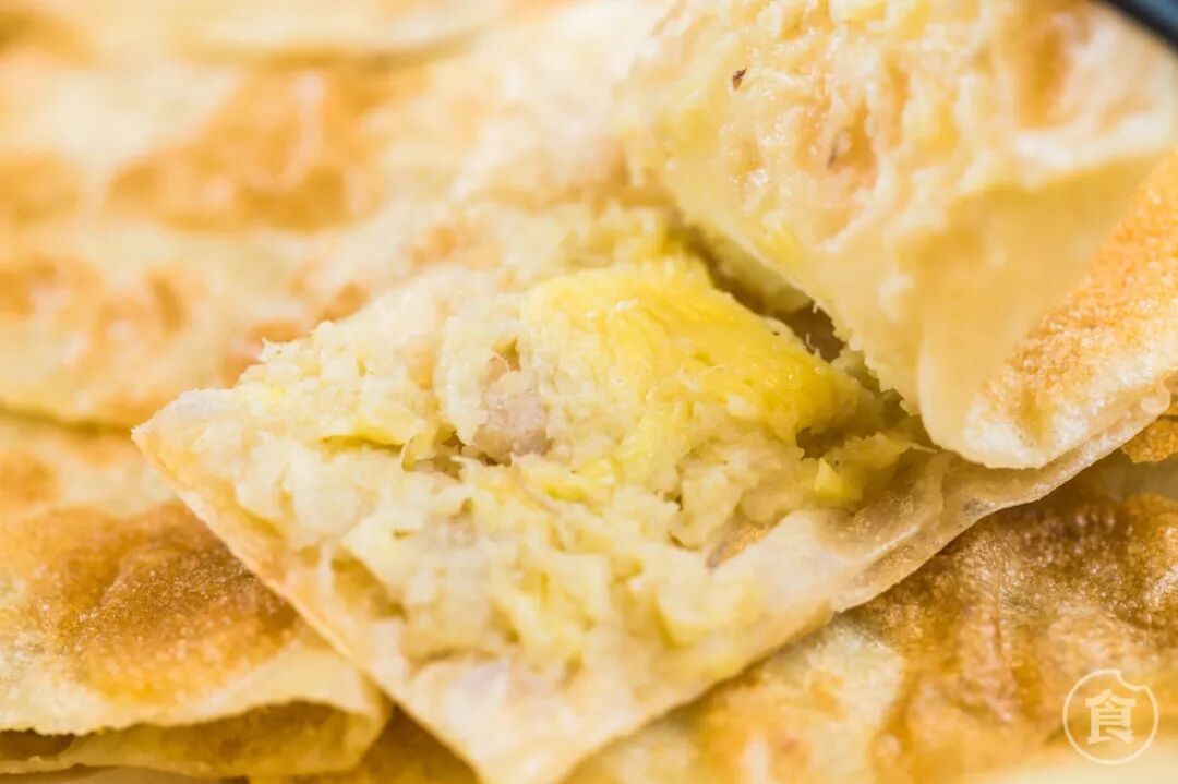 薄薄的饼皮中夹着超大块的榴莲果肉