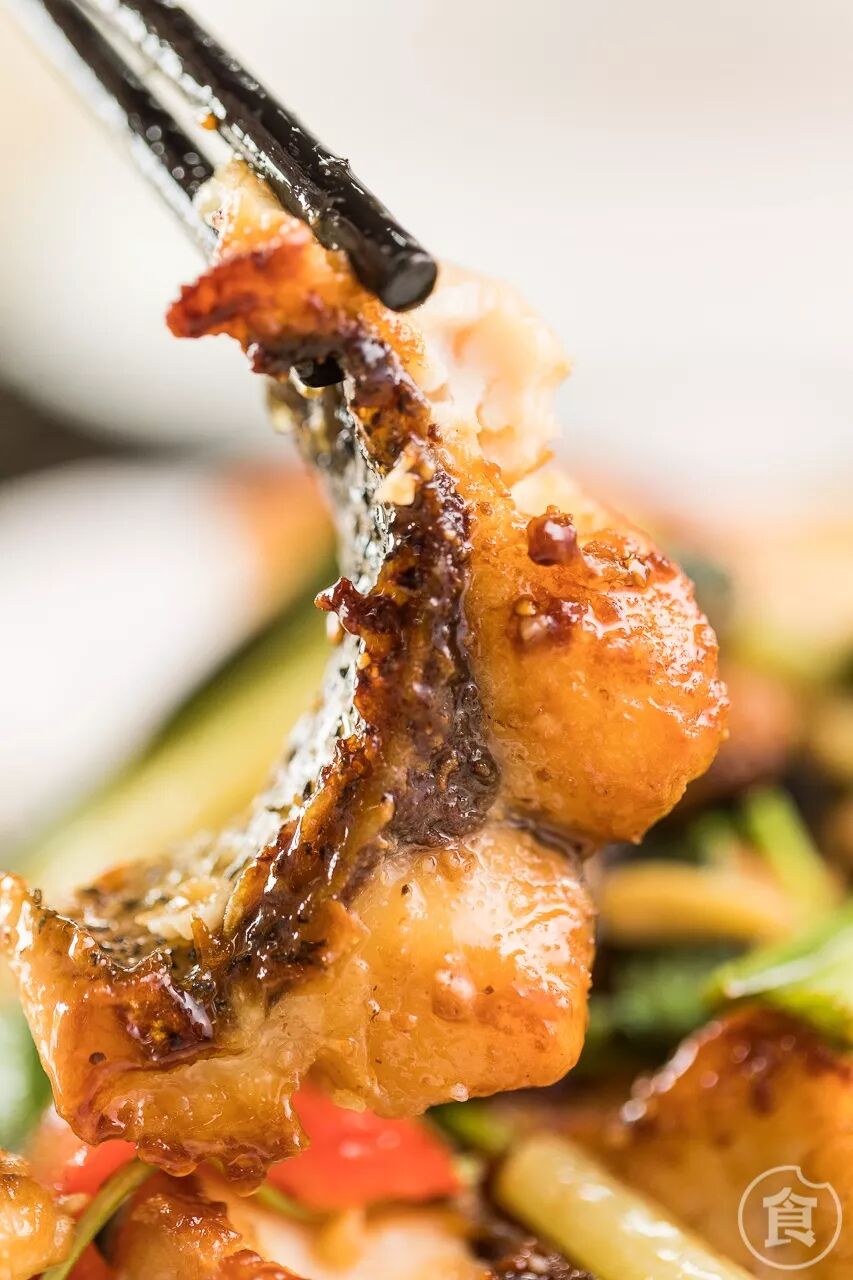 鱼肉厚实干身,焦嫩鲜美。简单的姜葱蒜足以增添不少风味。鱼脂的甘香融合了酱汁味道,越吃越香。