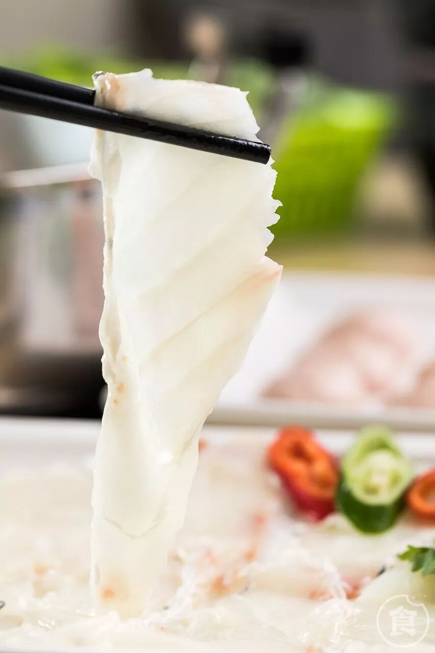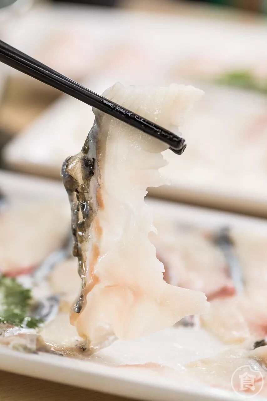 活鱼每日现杀。在厨师的巧手刀工之下,每一片都是晶莹透亮的水晶鱼片,无骨无刺。新鲜片出的鱼肉,完整肥厚,肉质紧致。