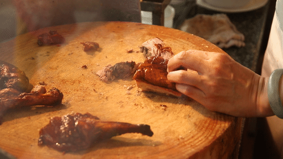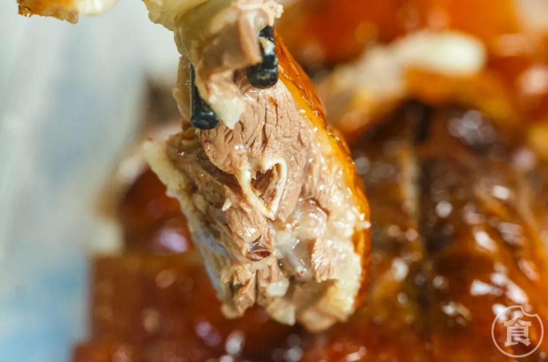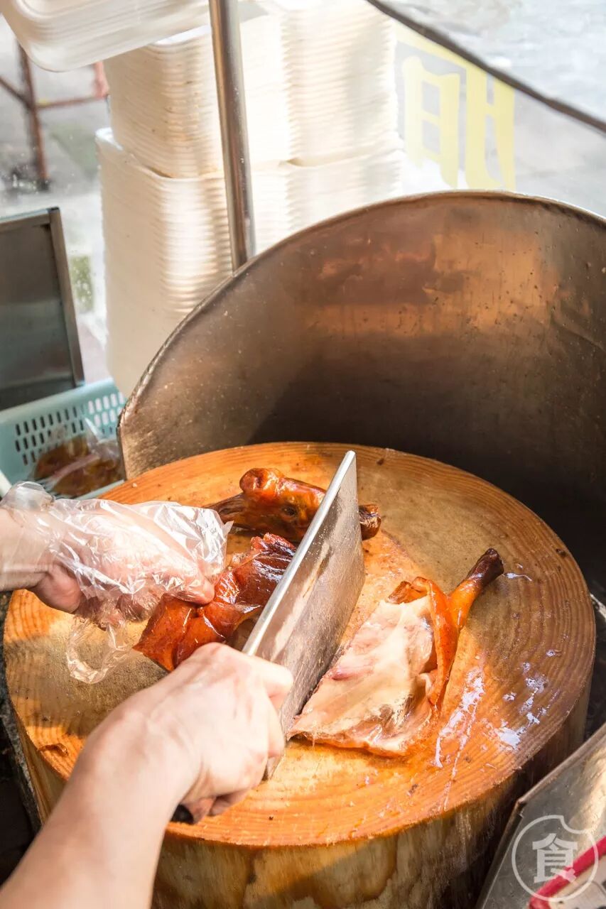 伴随着师傅挥动的刀,油脂从鹅肉渗出