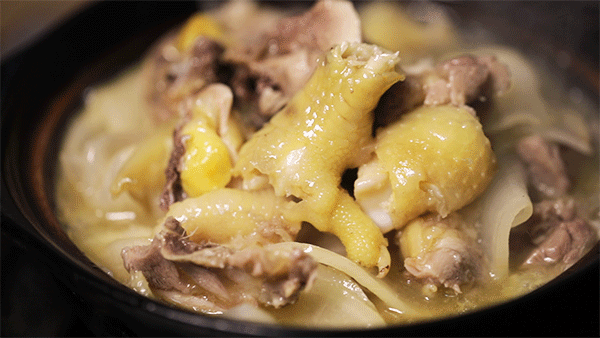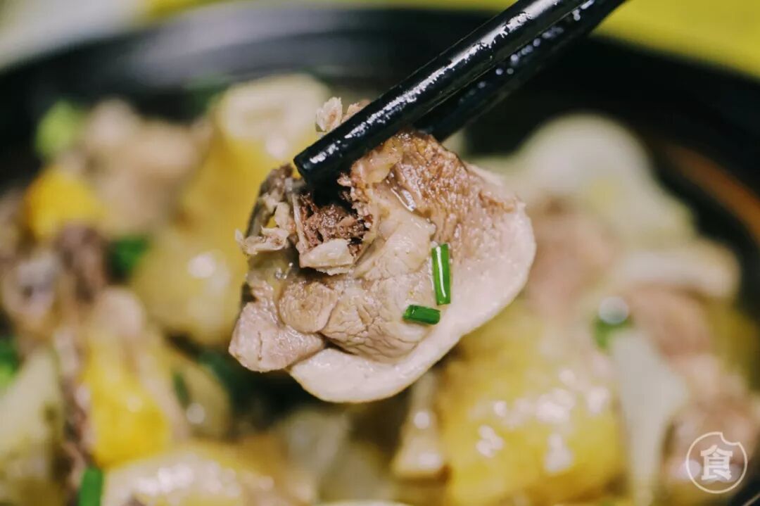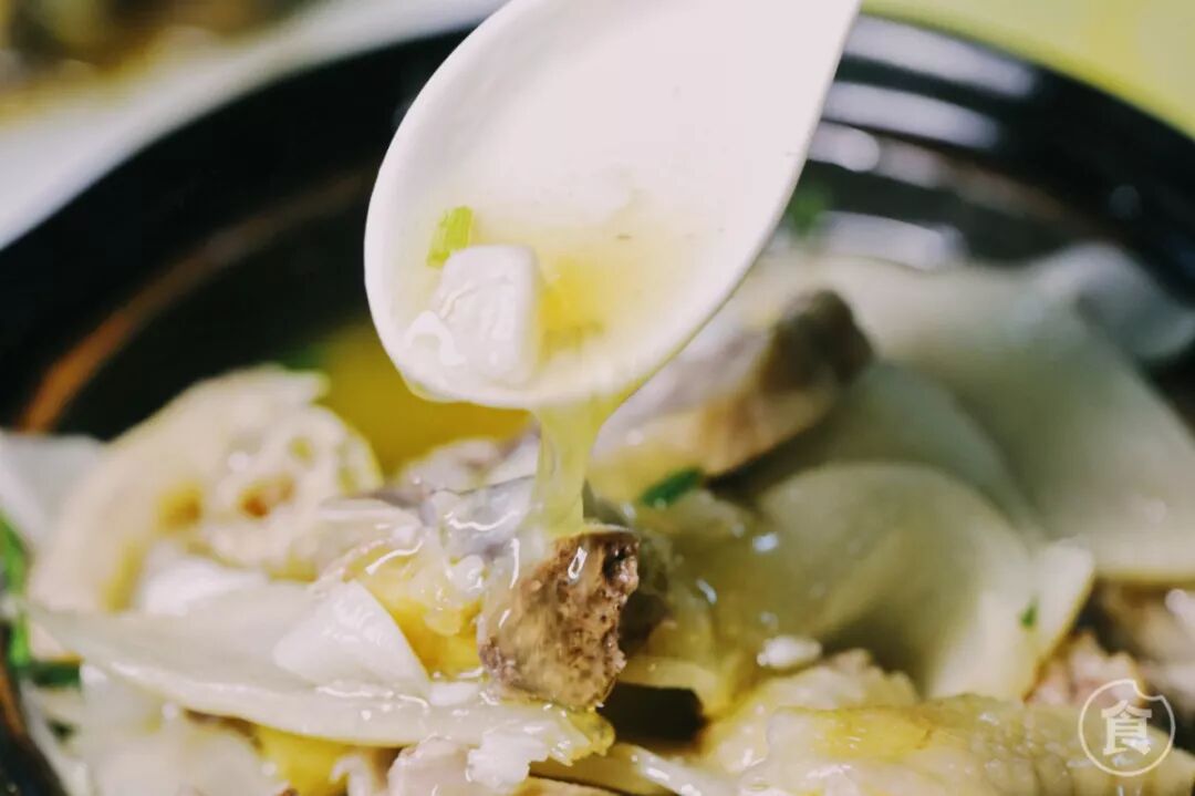 在入锅之前每只鸡都要经过洗礼,洒上一把盐巴,用力地搓着肉身,让每一块鸡肉都吮指入味。一口咬下嫩滑脱骨的鸡腿肉,肉质鲜香回味,汤汁浓郁甜美。