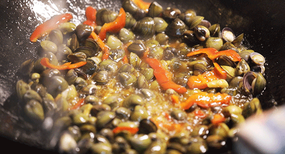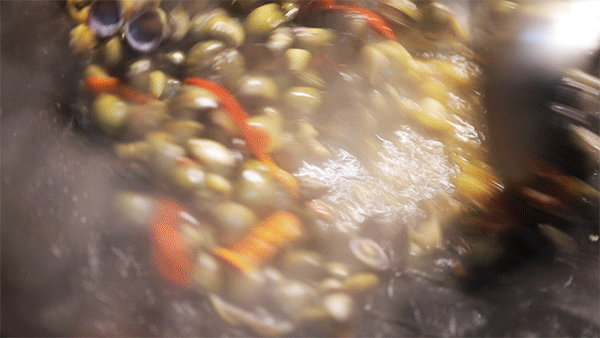 把配料都烧开直接下蚬入锅,这样炒出来的蚬很有“锅气”。大火翻炒几下等壳全部打开,就可以收汁起锅了。