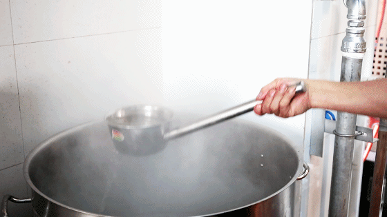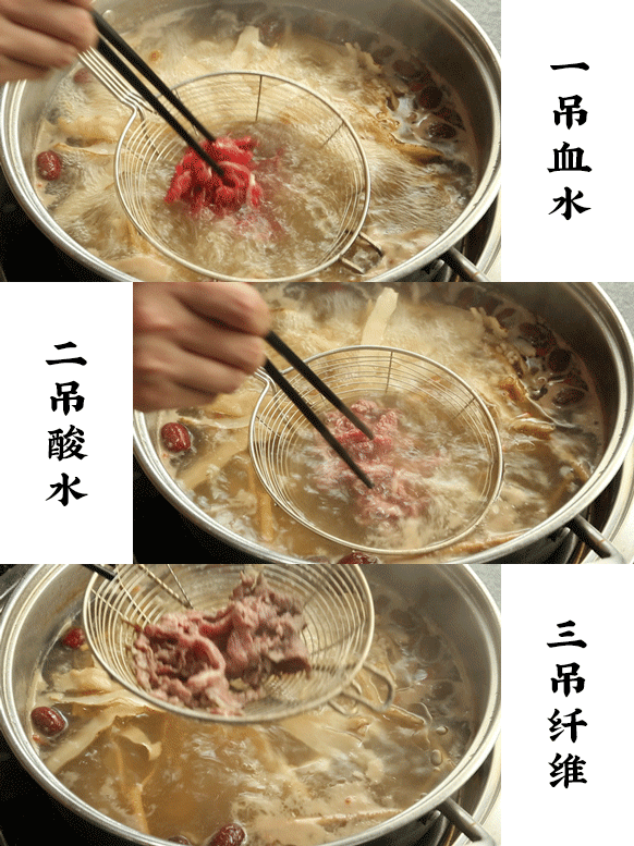 鲜牛肉放入漏勺里,沉入滚烫的锅中