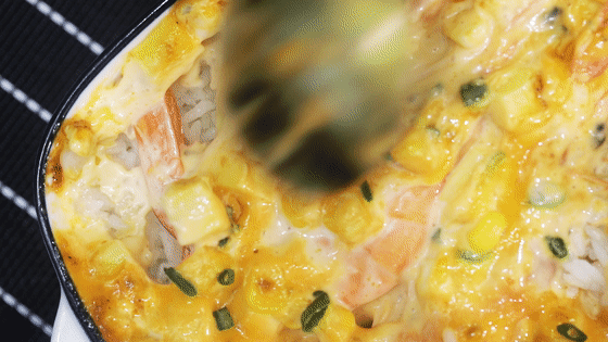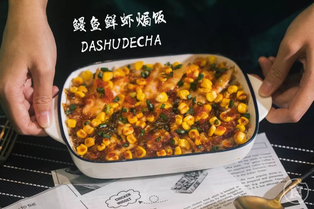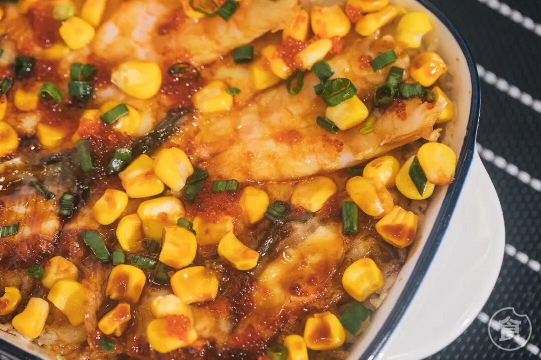 表面铺满了鳗鱼、鲜虾和玉米粒