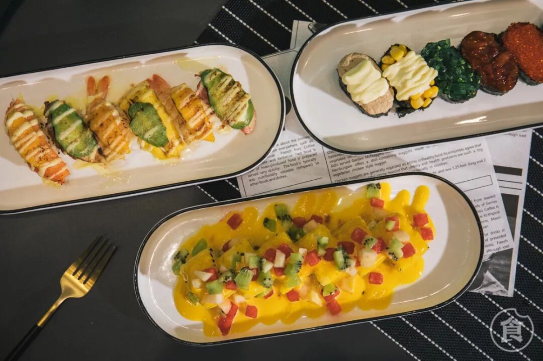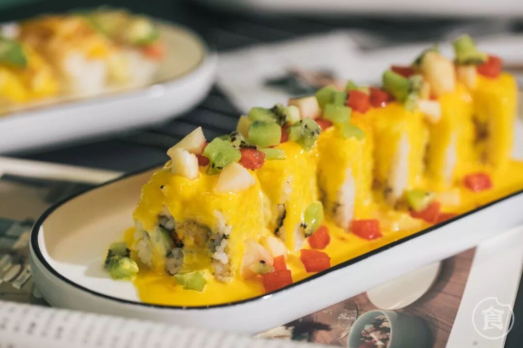 鲜果炸虾卷、火炙寿司拼盘、军舰寿司拼盘
