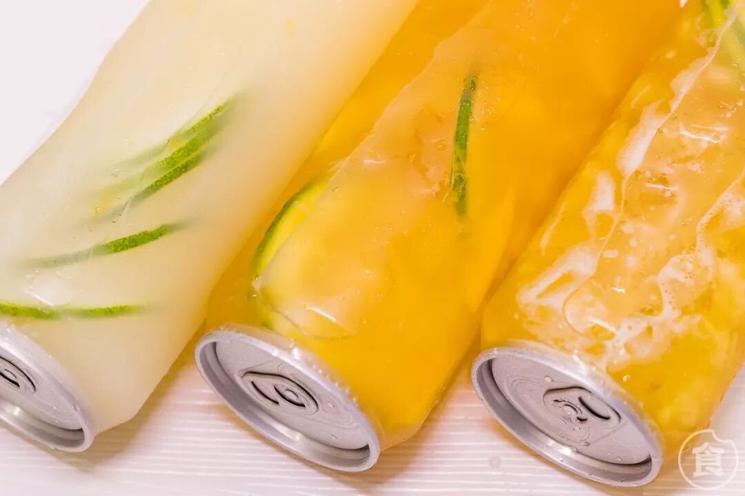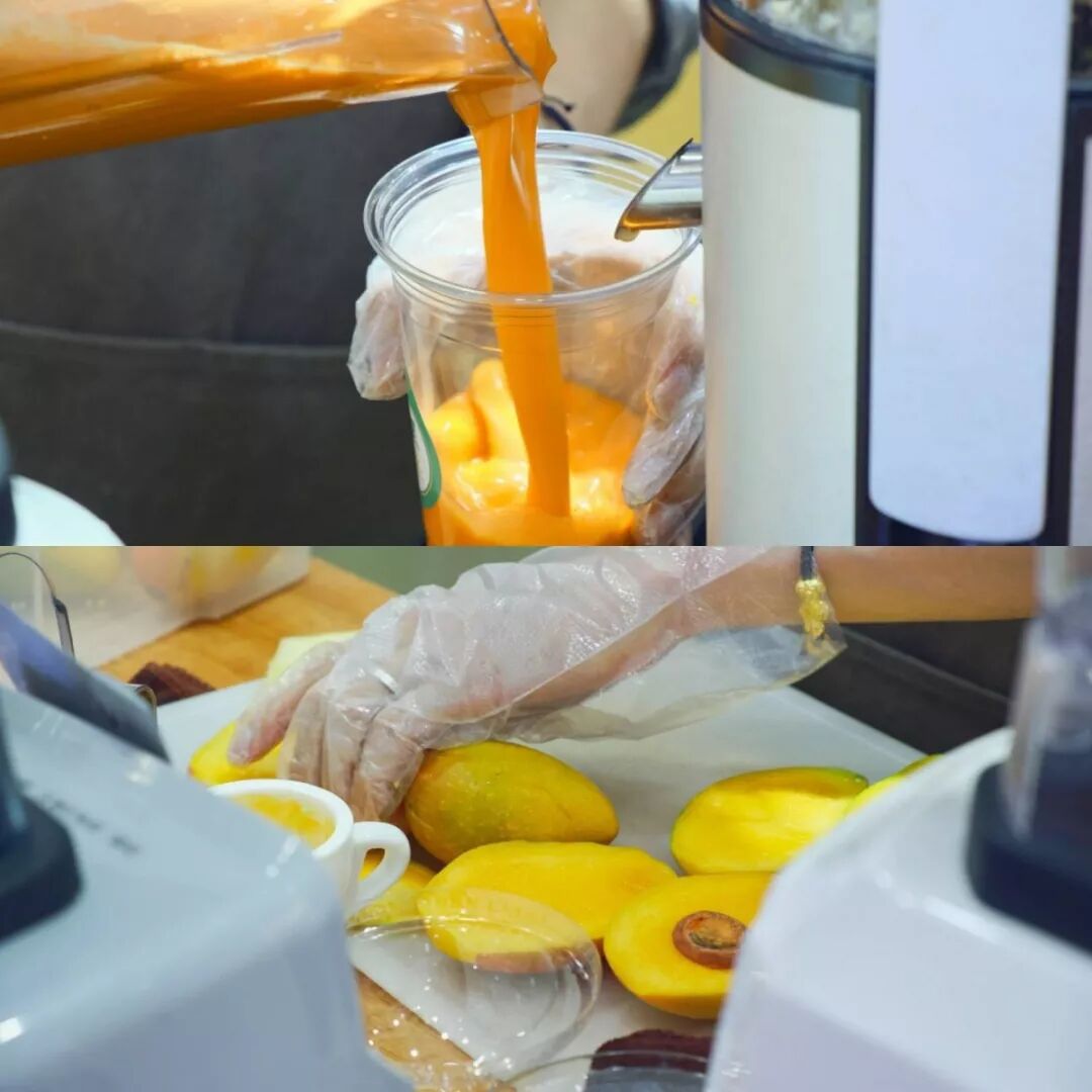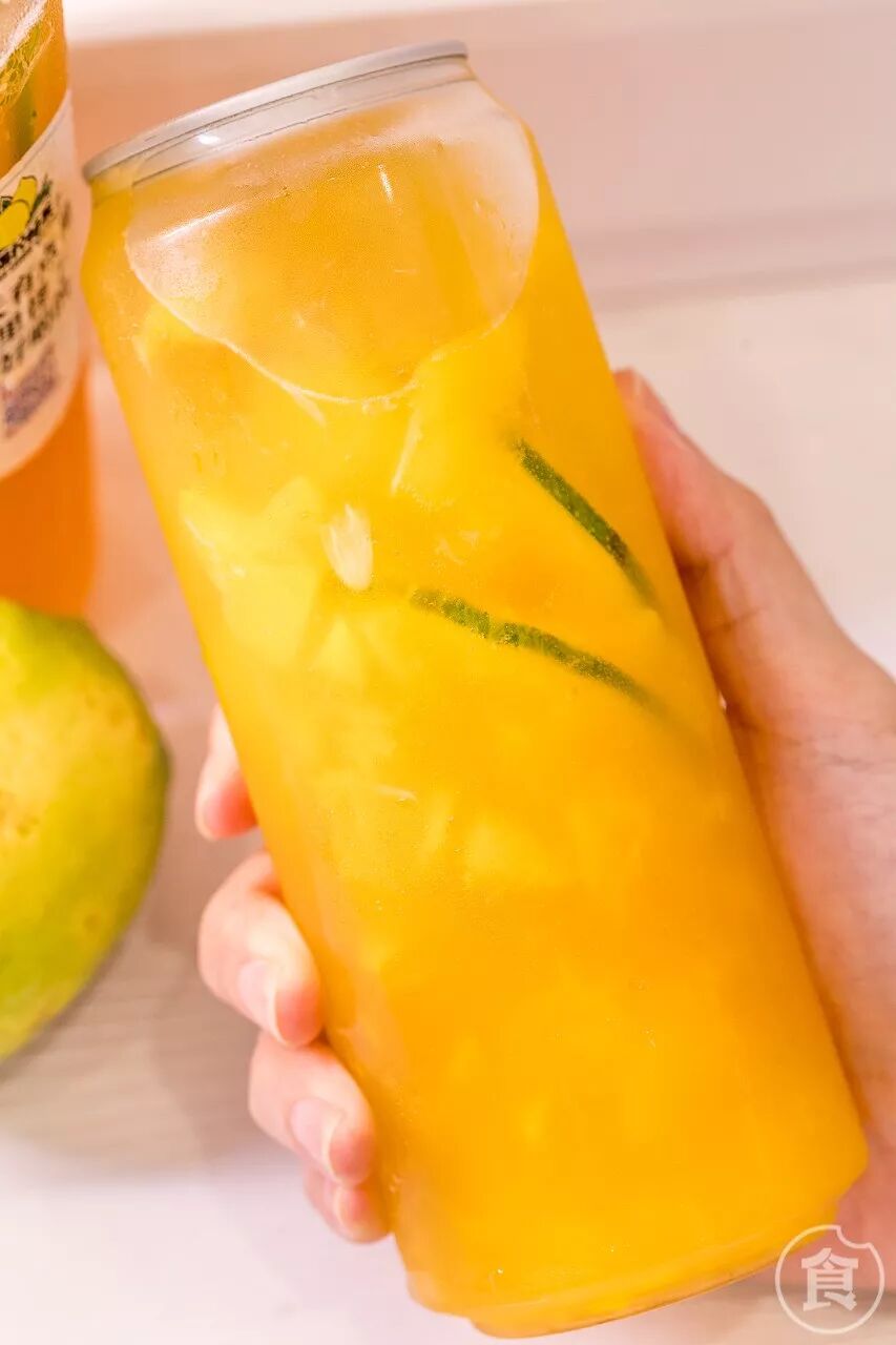 满杯鲜芒果真是撩人,许多芒果果肉躺在易拉罐里荡漾,