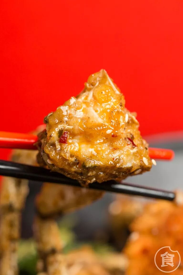 牛蛙经过提前炸制,肉质松软,轻轻一拨就能把“蒜瓣肉”脱骨。肥嘟嘟且饱满的蛙肉焦香柔软,必须蘸满酱汁吃。