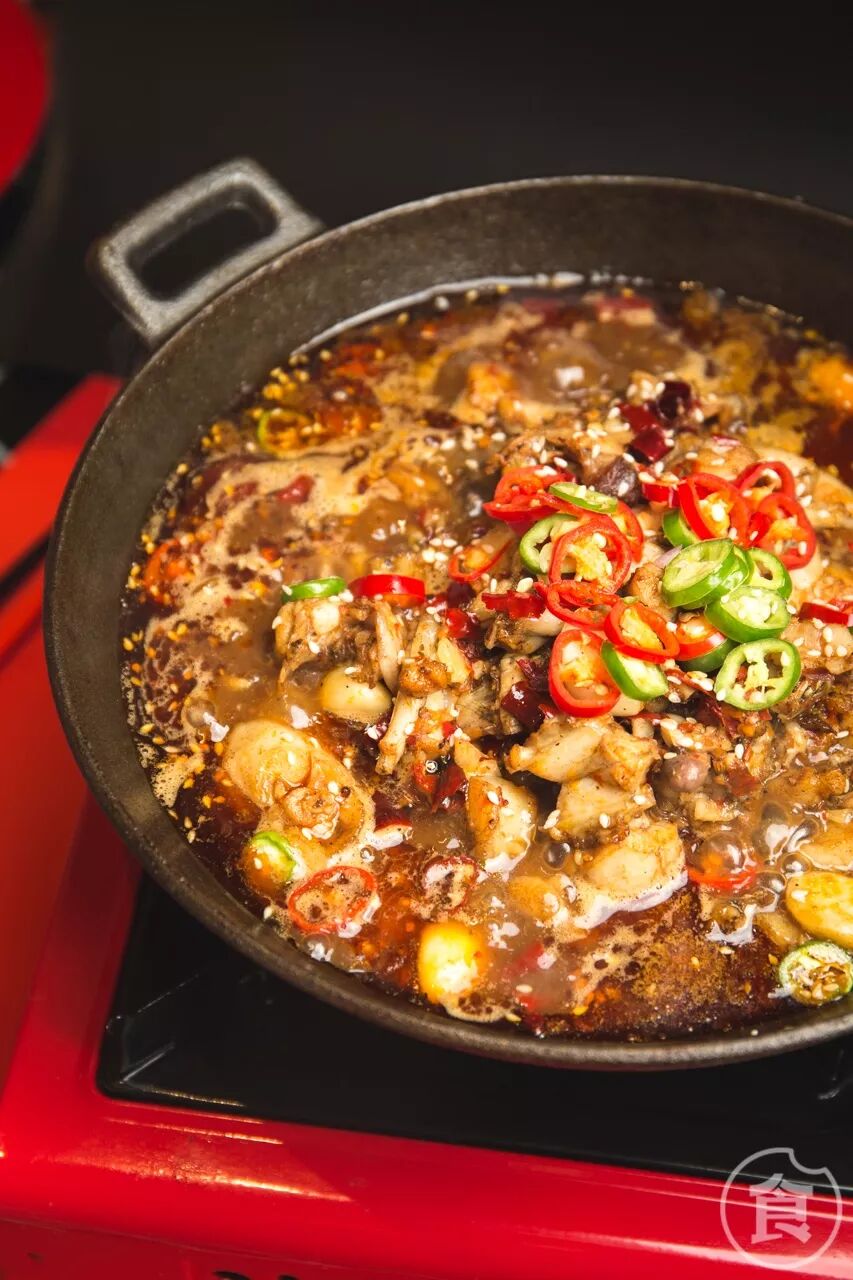 牛蛙锅适合边聊天边吃,小火慢煮保温,味道越煮越浓郁,也会越来越辣。偏好重口的话,上桌后可以煮5分钟再下手。