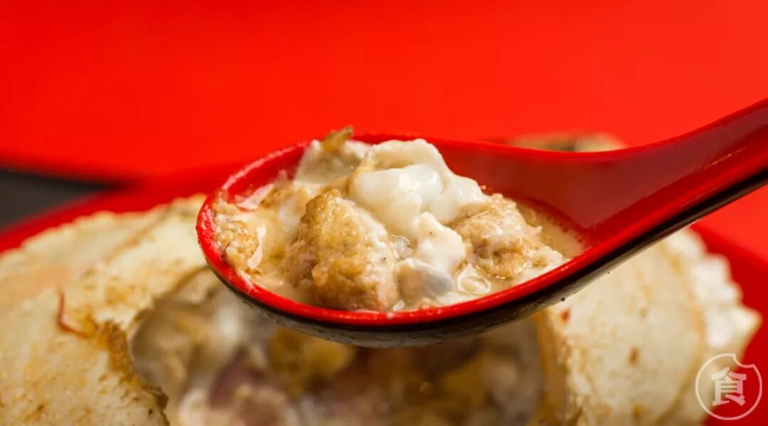 面包蟹有捕捞期,这个季节只能吃到公蟹。虽然没蟹黄,但胜在蟹肉吃起来又厚又嫩。蟹壳里的蟹膏也别浪费,用勺子刮下,把盘底的香辣酱拌入,一口甘醇。