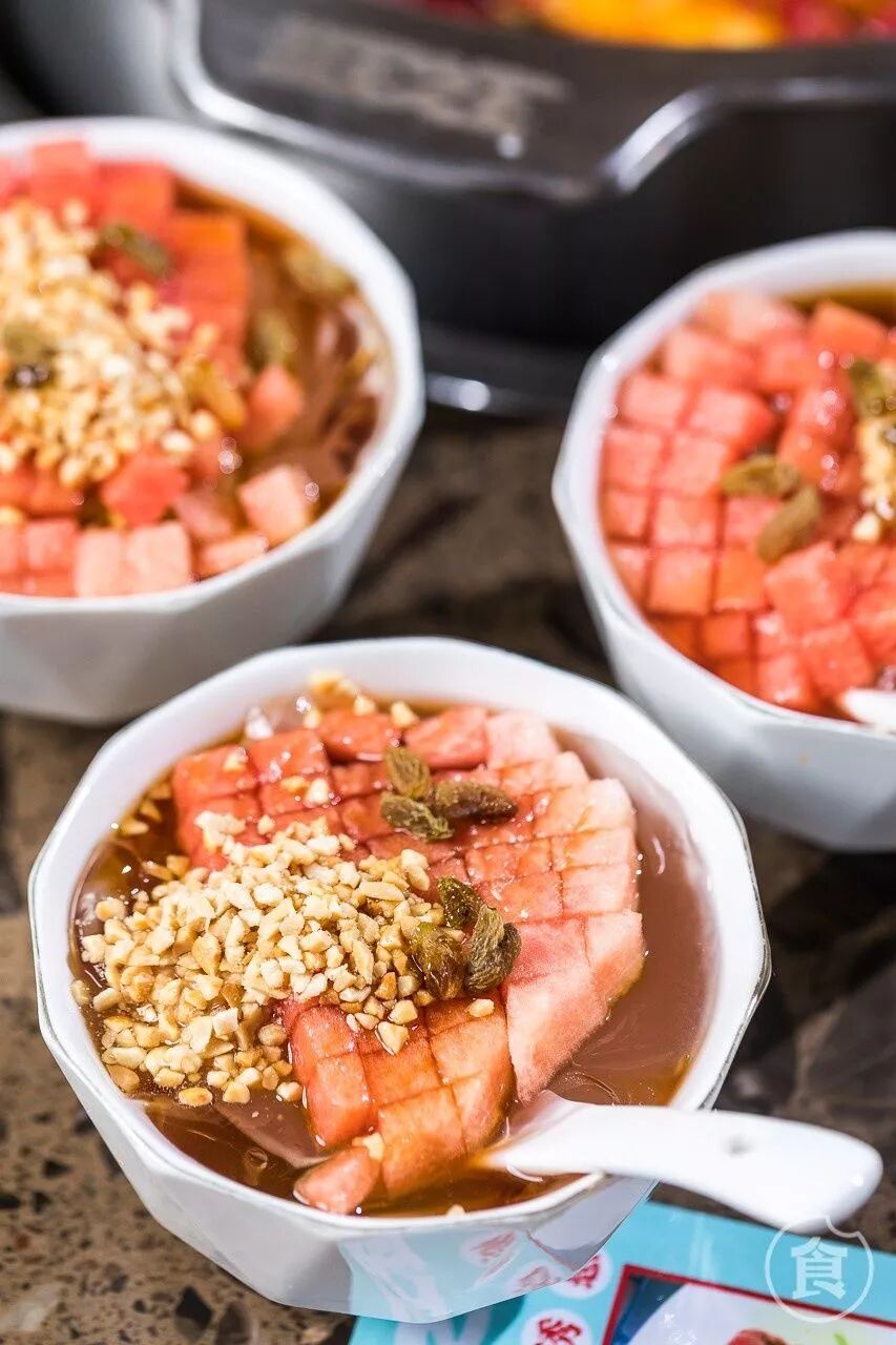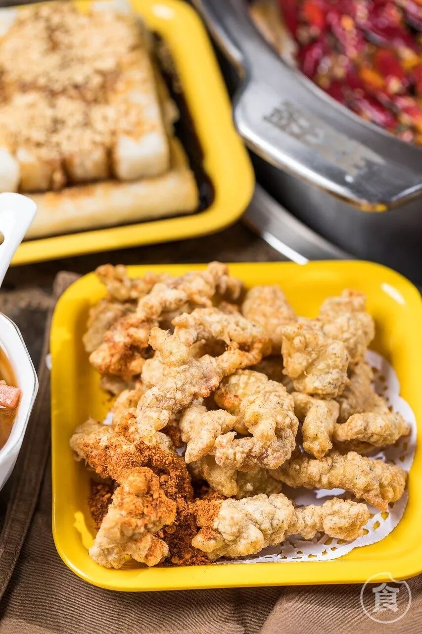 饱腹一顿后,餐后小吃不能少。红糖冰粉铺满足料水果,花生碎和葡萄干增加口感;现炸酥肉香酥可口,偶尔还能咬到花椒粒,略麻但过瘾。