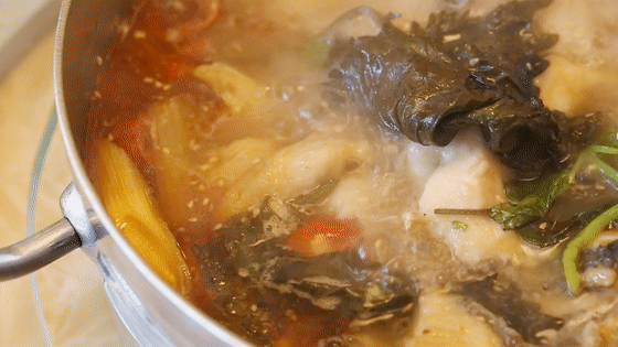 上桌前会铺上紫苏叶。开火煲煮后,紫苏特有的味道渗进汤汁里,越煮越浓郁,味道也更特别哦。