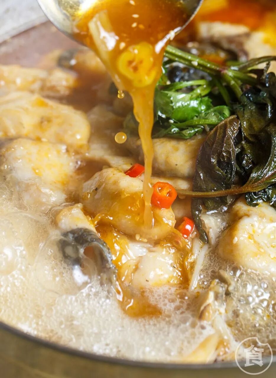 这口汤汁里还加了豆芽和白萝卜,带着些酸辣,味道浓郁,辣而不燥。即使不蘸料吃鱼也很够味,适合拌饭吃。