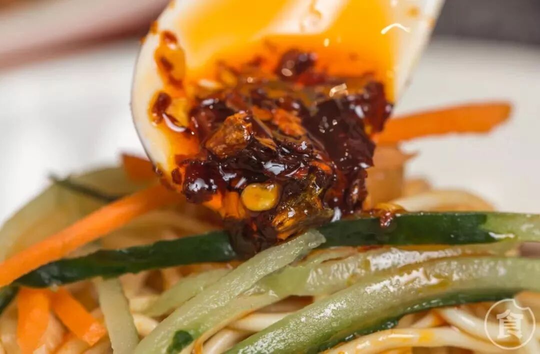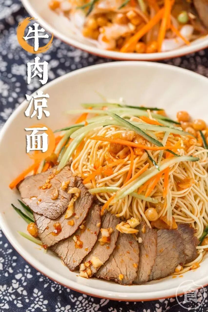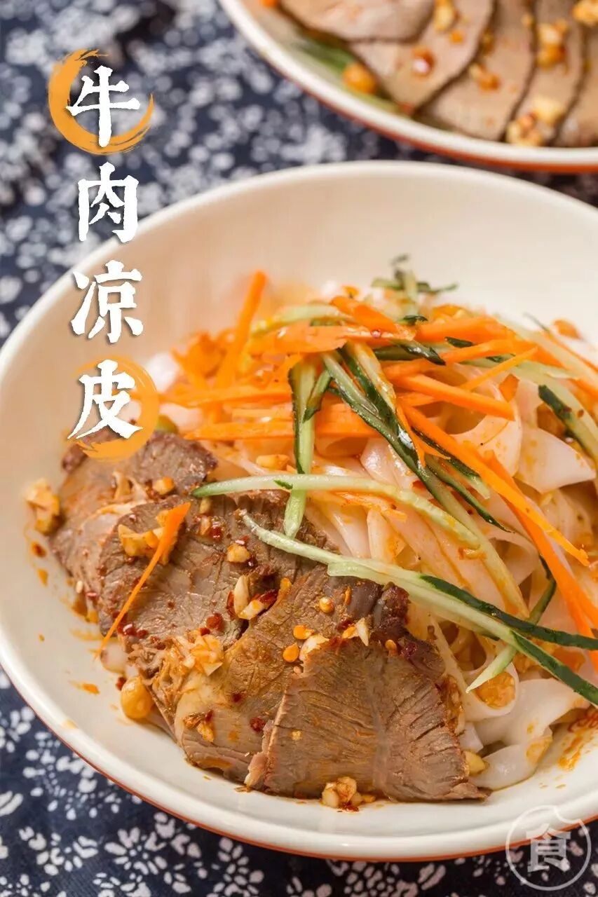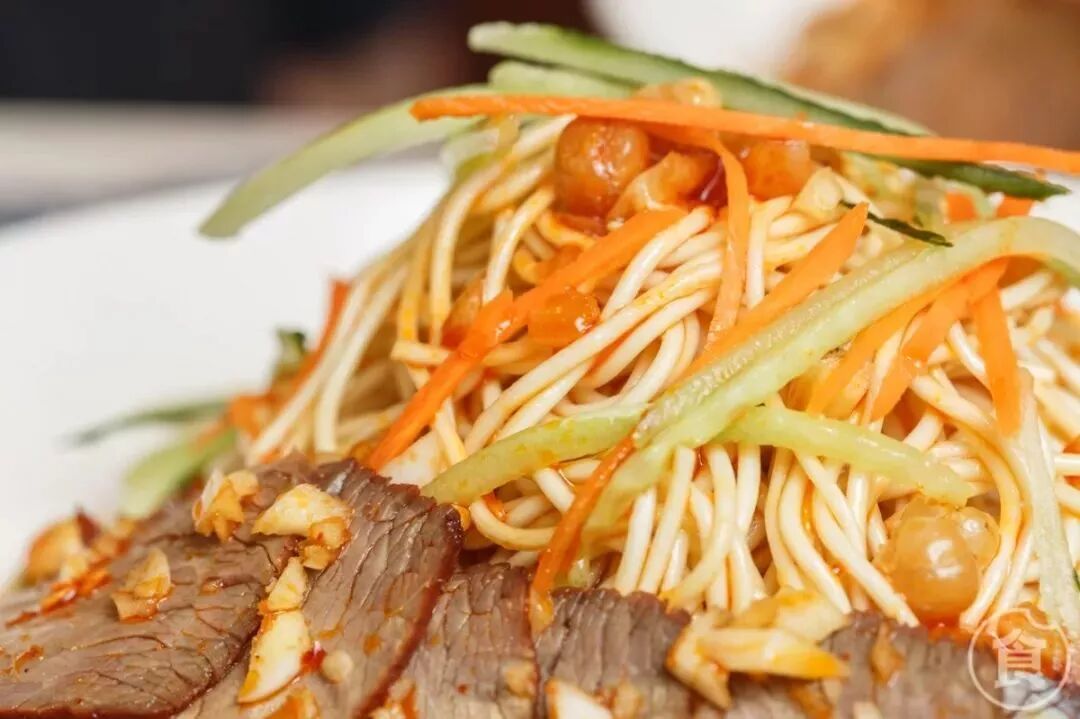 夏天没食欲?凉面/凉皮就很适合你!面上铺了几大片牛肉,还有黄瓜和红萝卜增加清爽感。一般默认微辣,辣椒油拌上蒜汁老陈醋,酸酸辣辣很是开胃。