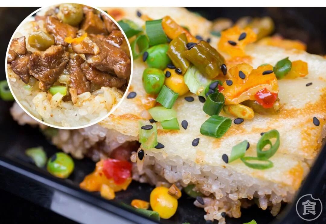 豆皮是绿豆大米磨浆制成的,刷上蛋液后煎香。一层豆皮一份糯米,底下还藏了许多肉末、酸豆角和火腿,香煎脆皮,内里软糯。最后撒上来自家乡的红油萝卜干,解腻有味。