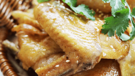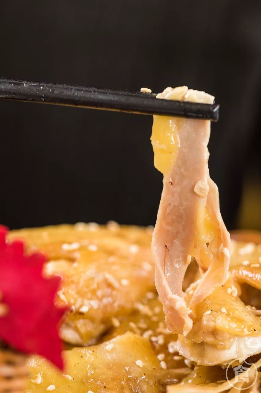 金黄剔透的鸡皮下包裹着嫩口的鸡肉