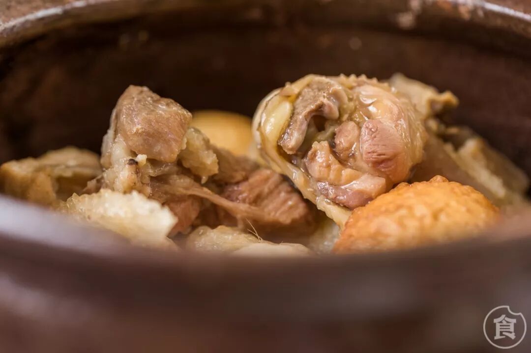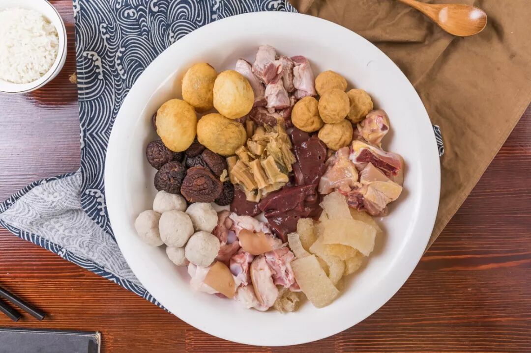 炸猪皮、猪脚、猪肉丸、猪肝、冬菇、梅菜