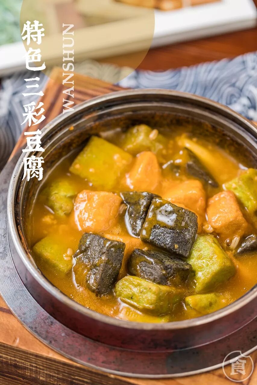 用黄豆制成的豆腐再用黑芝麻、胡萝卜和菠菜着色
