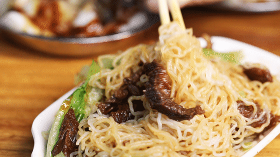 把焖好的牛腩和汁淋在米粉上,快速地捞匀。让每一根米粉都拌上颜色就可以开吃了,干捞米粉的好处就是不会被汤泡软泡烂,但是又恰到好处。