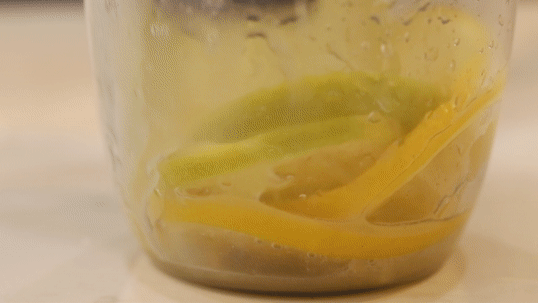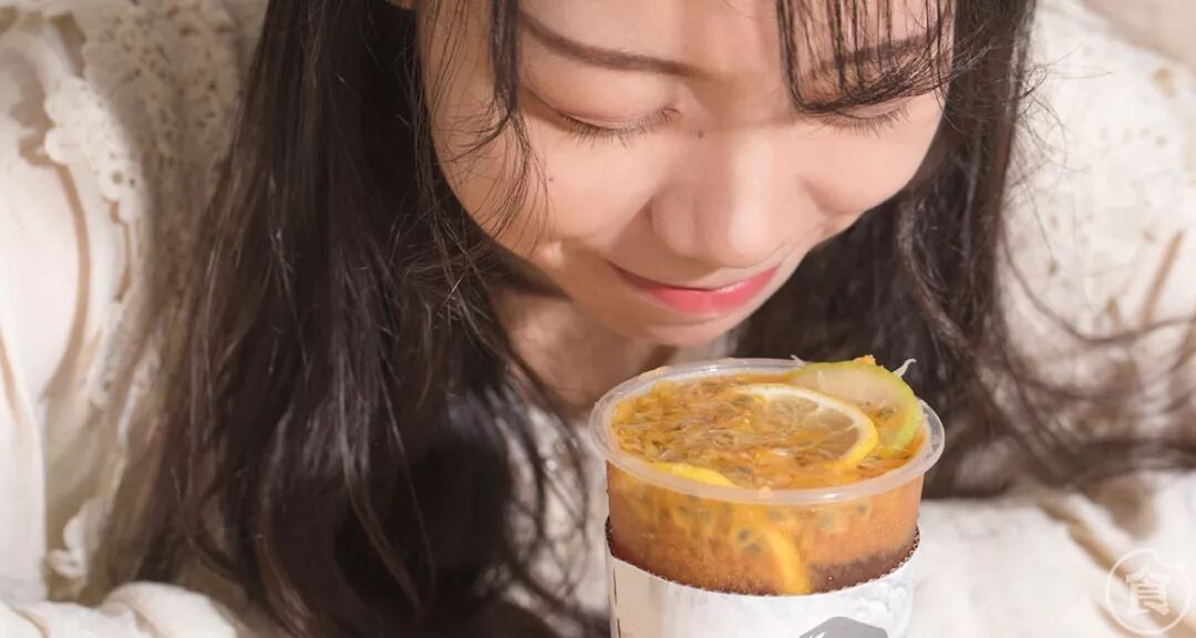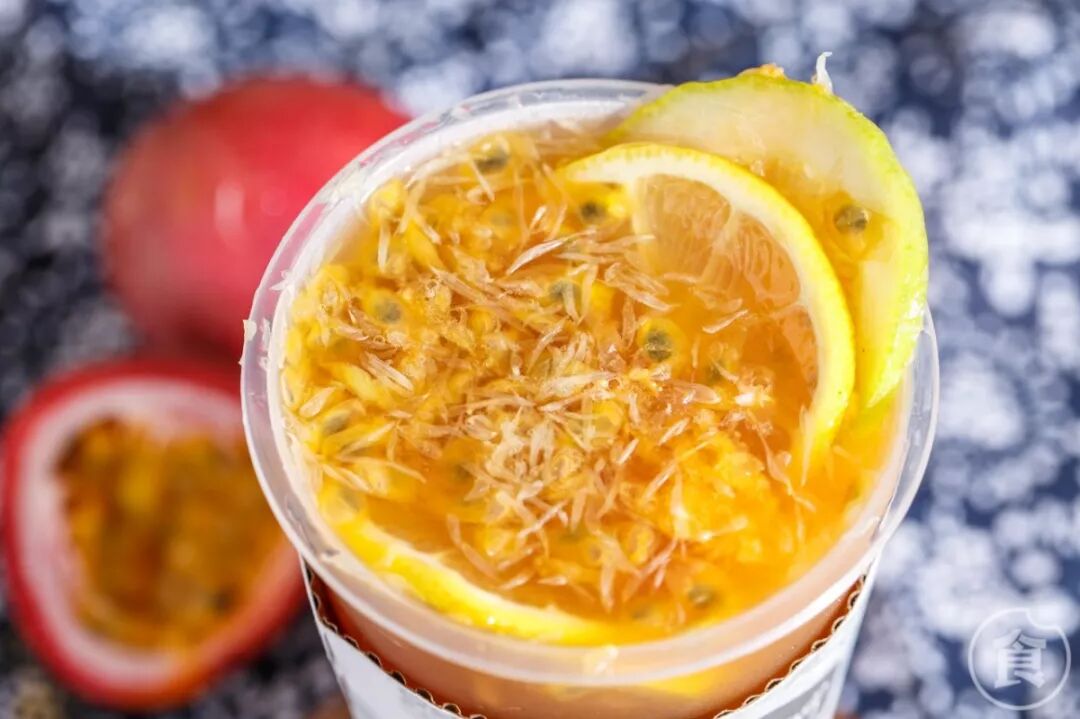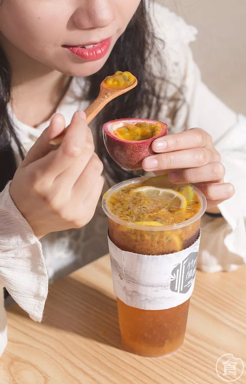 把百香果切半“掏心”,挖出满满会爆汁的百香果粒。喝的时候还混有丝丝柠檬果肉,是双重酸味的碰撞,是不同层次的酸感。