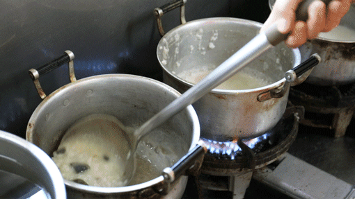 煮粥的师傅围着灶台忙碌着