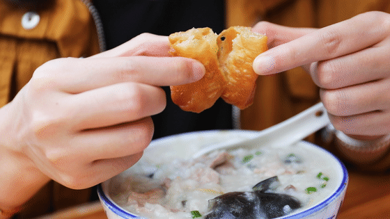往冒着热气的粥里加上一小段油条搭配着吃