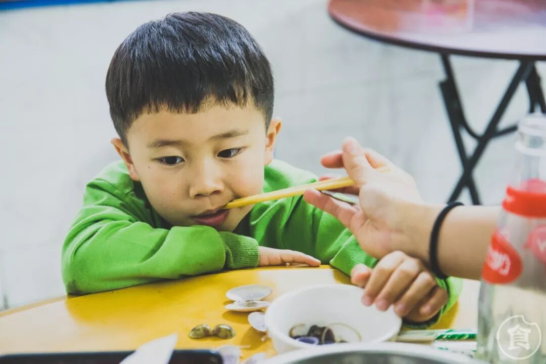 喜欢和伙伴比比谁先挑满一勺蚬肉