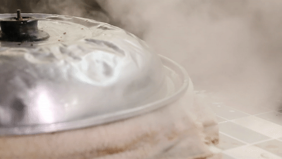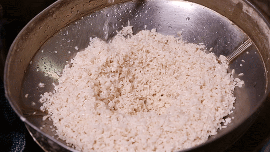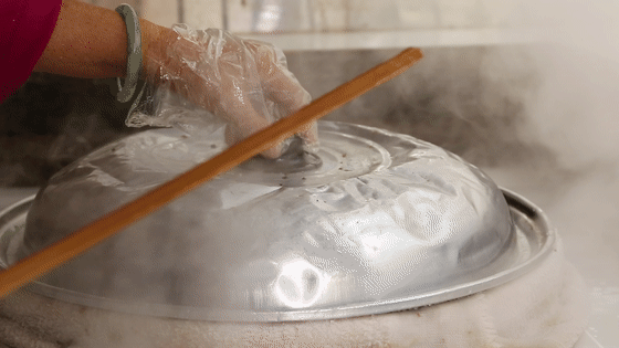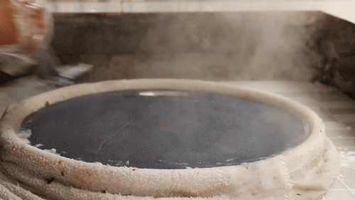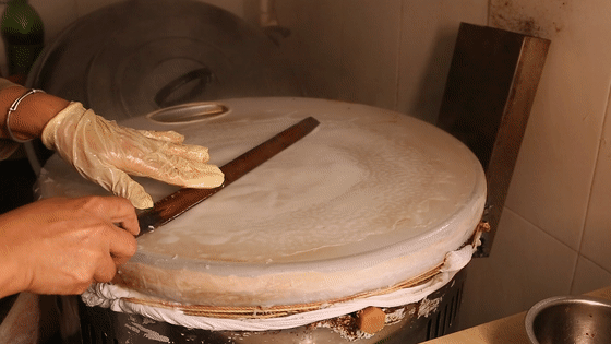 把磨好的米浆快速的平摊在布上,布的纤维很密,不会渗下去。沈阿姨说不能急,一分钟只能蒸一条。