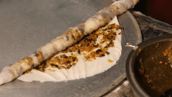 在案板上用鸭毛做成的刷子刷一层薄薄的油,防止面皮被粘住。再挖一勺肉馅铺在上面,卷一卷就OK啦!