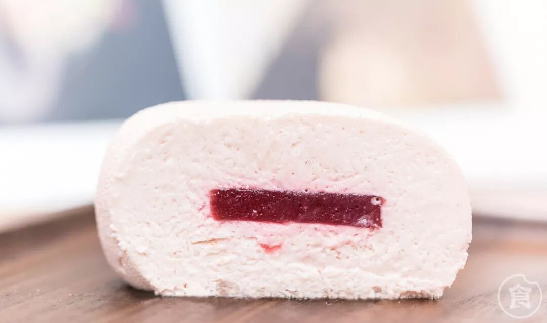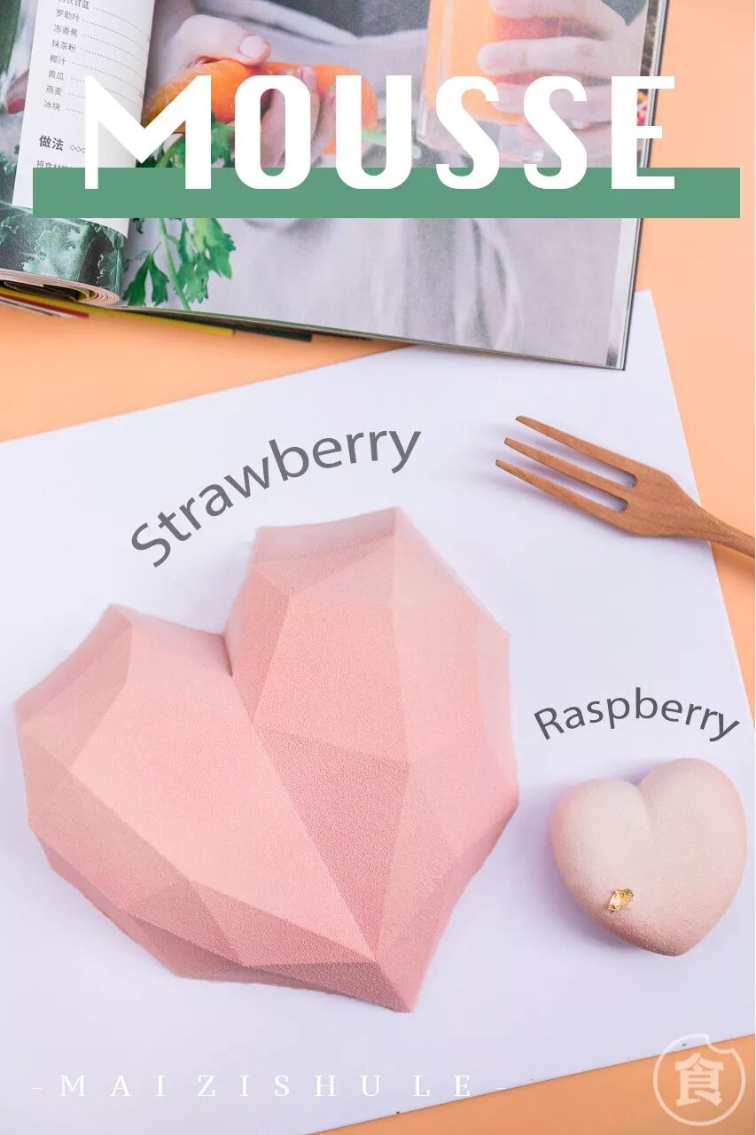 外层是草莓口味的慕斯,中间是覆盆子果酱