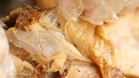 更惊喜的是那金黄的鸡皮,超级薄嫩,可以轻松扯开。细腻的鸡皮滑入口中,当真是入口即化。皮下那一层薄薄的脂肪甘香油润,油而不腻。