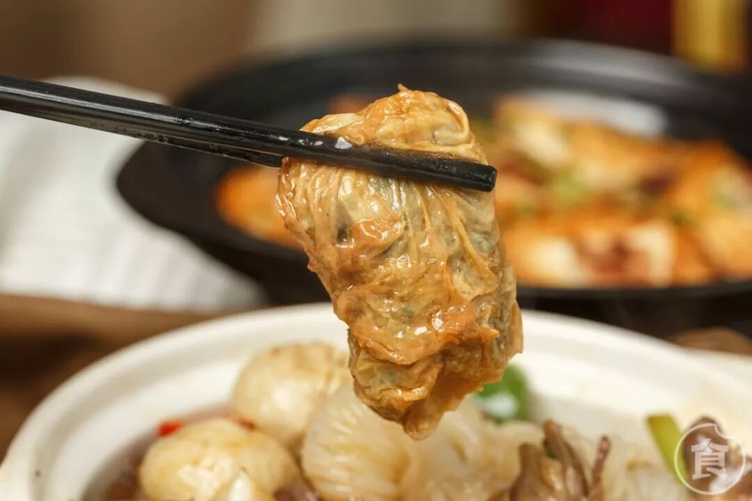 腐皮里包着艾叶和肉馅,味道特别;鸡胗、鱿鱼的味道为煲增添了更多的鲜香味,小粉丝也入味十足。筷子可以接二连三夹着不同的材料吃,好不过瘾。