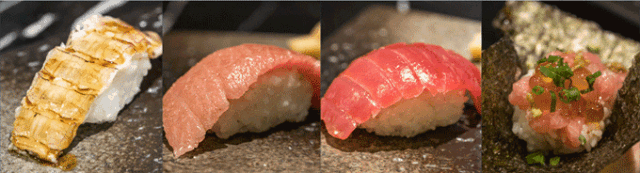 日本蓝鳍金枪鱼鱼腩切成恰到好处的薄厚,和调好味的米饭混合在一起。将寿司送进口中,清新微酸的醋饭饱满却极其松软,轻轻咬开鱼腩,细细品味脂肪的润,四处蔓延开来的味道,甜美而又和谐。