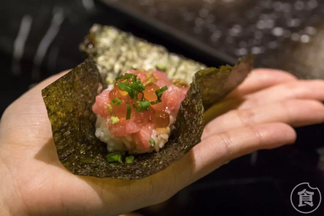 紫菜放着温热的米饭,盖上金枪鱼肉丁与饱满透亮沁凉的三文鱼子。一齐入口,肥美鱼子瞬间爆破的酣畅交织着紫菜的香脆与金枪鱼的鲜美,三者完美融合,味道富有层次感,霸道地直击味蕾。