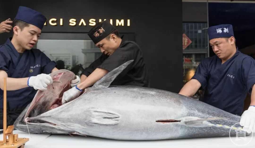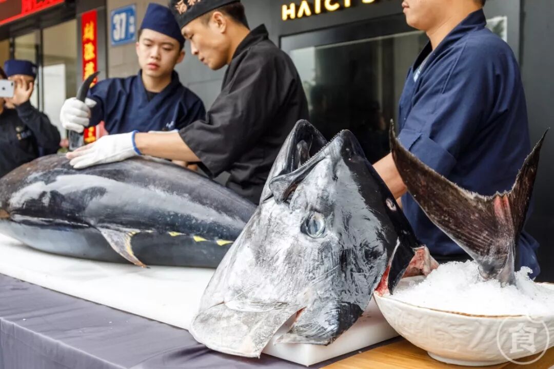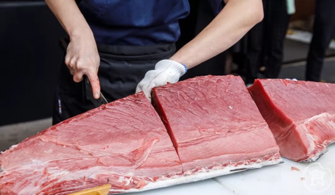 这次来到店里有幸看到一整条长1.7m,重220斤新鲜的日本蓝鳍金枪鱼现场开鱼。这条珍贵的蓝鳍金枪鱼价值超8万元,含有各种对人体有益的营养成分。
