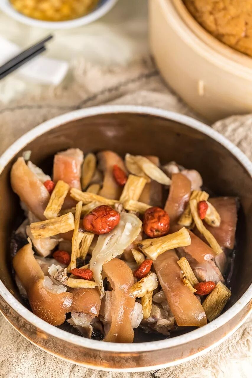 猪皮蒸炖后变得软糯滑弹,蹄筋也Q弹粘香。夹起一块猪手,吮吸脱骨几下,皮啊肉啊一下子就进嘴了,是软糯Q弹、颤颤巍巍的触感啊!