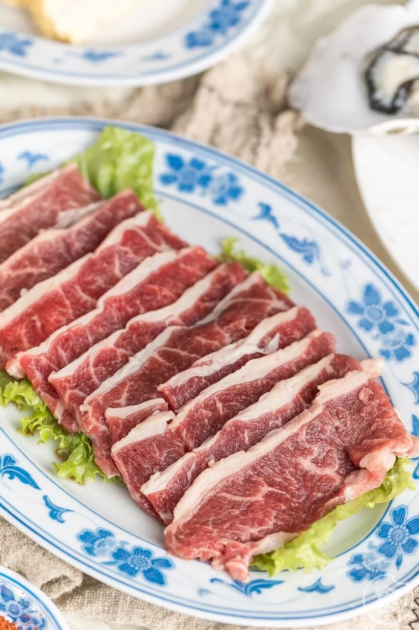 每日新鲜到店的肉类,现点现切现摆盘。吃牛肉要厚切,感受嘴巴充盈的满足;吃羊肉必须薄切,在细嚼慢咽里回味油脂的甘香。