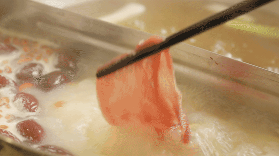 因为片得很薄的缘故,鱼肉和羊肉都无需涮煮太久,大概十来秒就可以入口了。药膳汤底会赋予肉片特别的药香,吃下便觉得很滋补。喜欢原汁原味的也可以涮清汤锅哦~