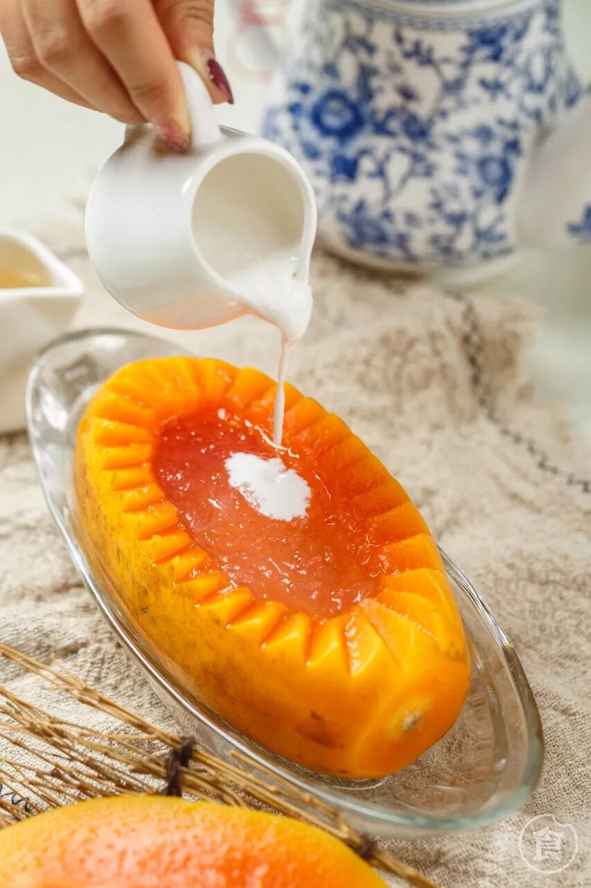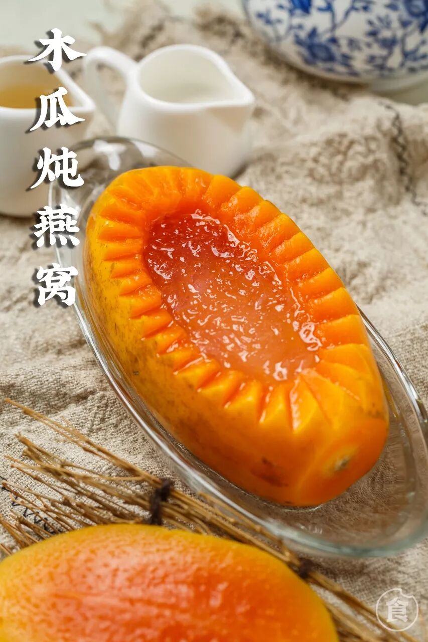 燕窝一直以来被奉为“养颜佳品”,从古至今都是小仙女们的挚爱。将燕窝放进挖空的木瓜盅里炖煮,木瓜的清新果香渗进丝丝燕窝,口感更佳。