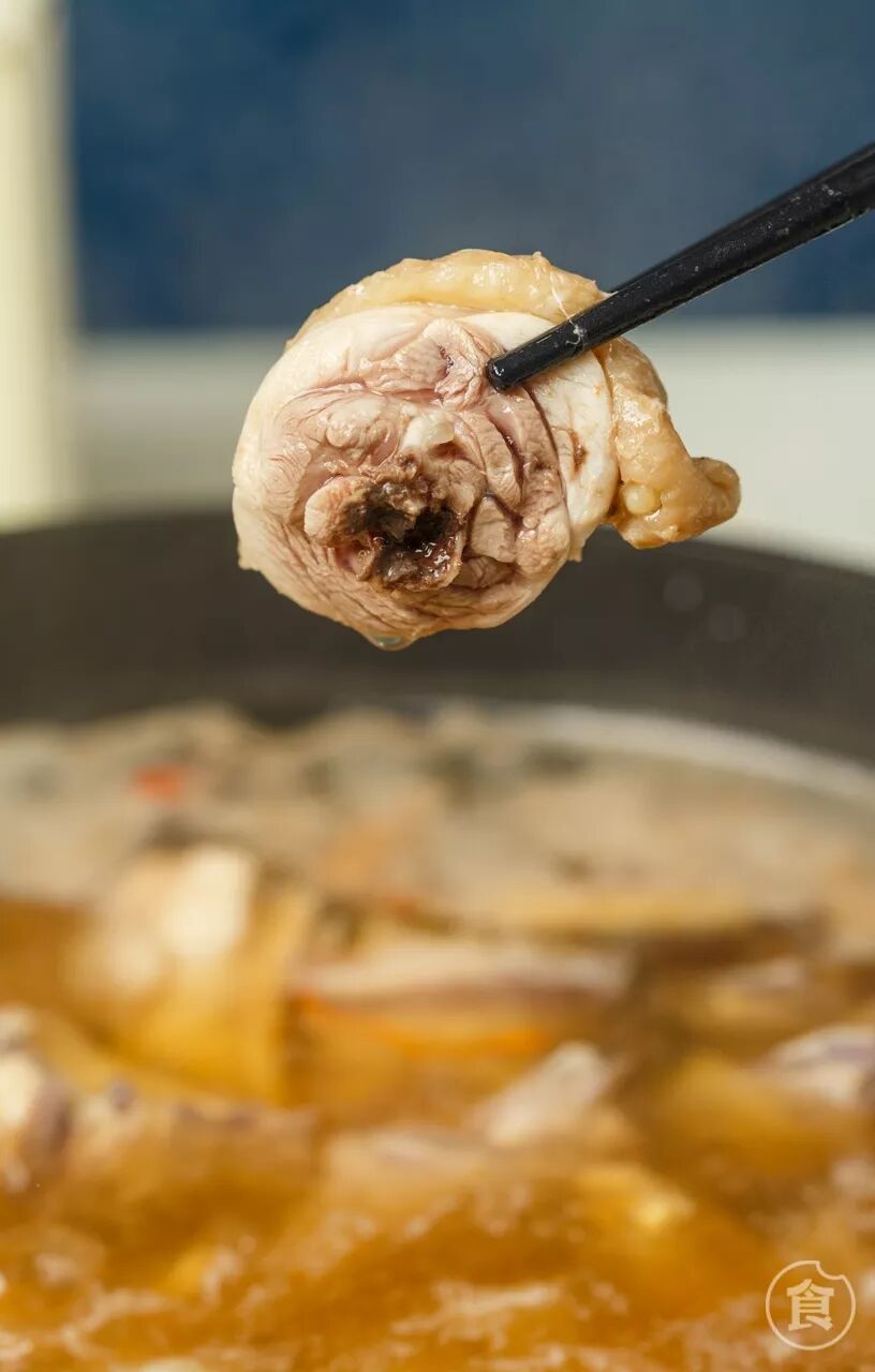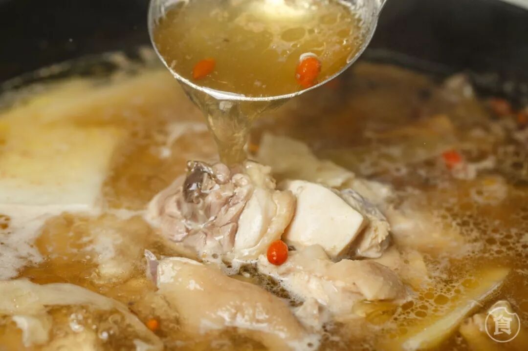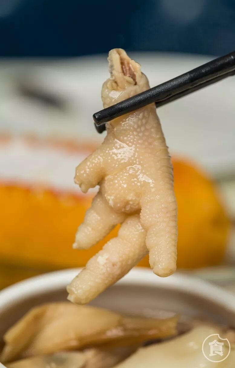 经过数小时的炖煮,汤水变得金黄清澈。炖盅里用的是新鲜鸡脚,胶原含量很足。鸡脚的表皮软嫩略黏,喝完汤啃鸡脚也是一大乐趣。