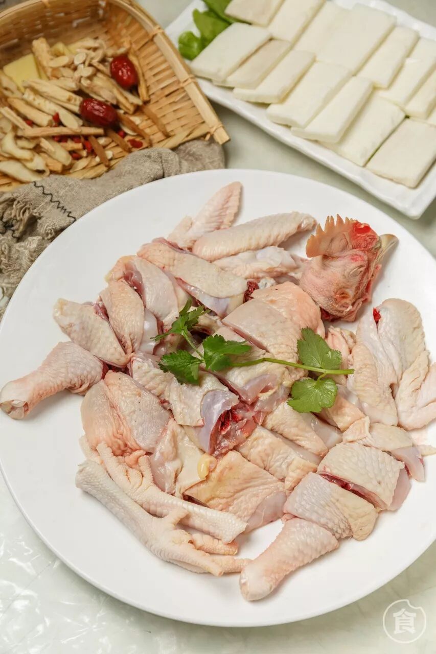 药膳锅底建议点只走地鸡来搭配。新鲜的走地鸡被贴心地斩成小块,既方便涮煮也方便吃。