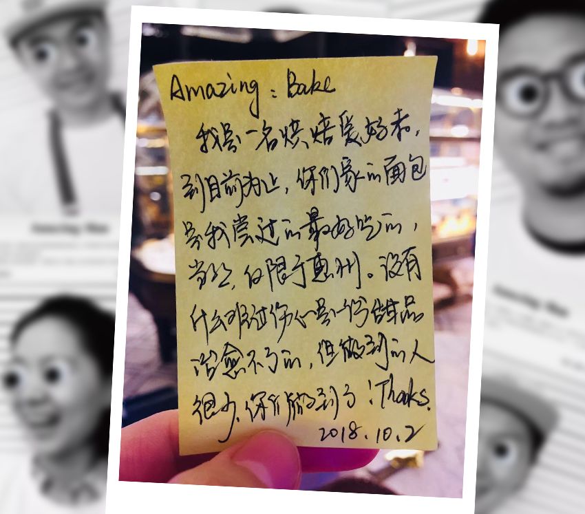 “我是一名烘焙爱好者,到目前为止,你们家的面包是我尝过最好吃的,当然,仅限于惠州。没有什么难过伤心是一份甜品治愈不了的,但能做到的人很少,你们做到了!Thanks.”