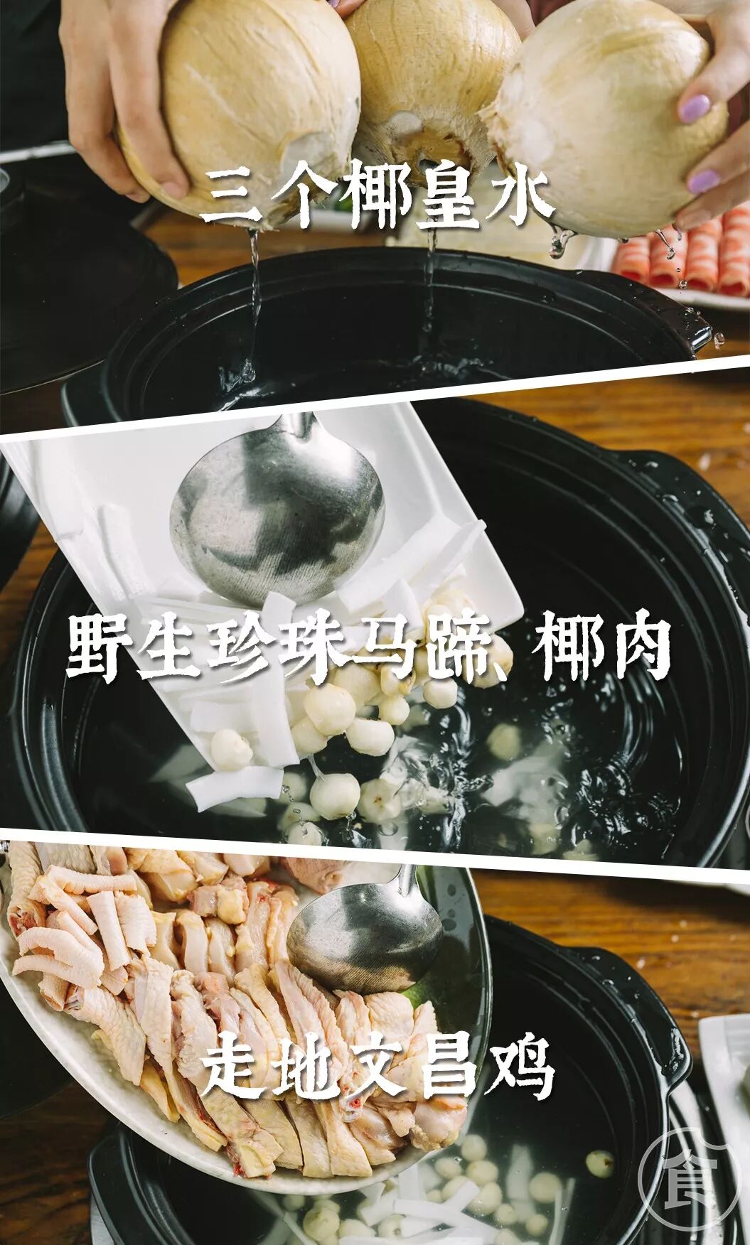 每一锅椰子鸡,都是当着食客的面现开现倒椰汁。用足3个椰皇,再加入野生珍珠马蹄、老椰肉和鸡肉,盖上锅盖就能等吃。全程不添加多余的调味料。