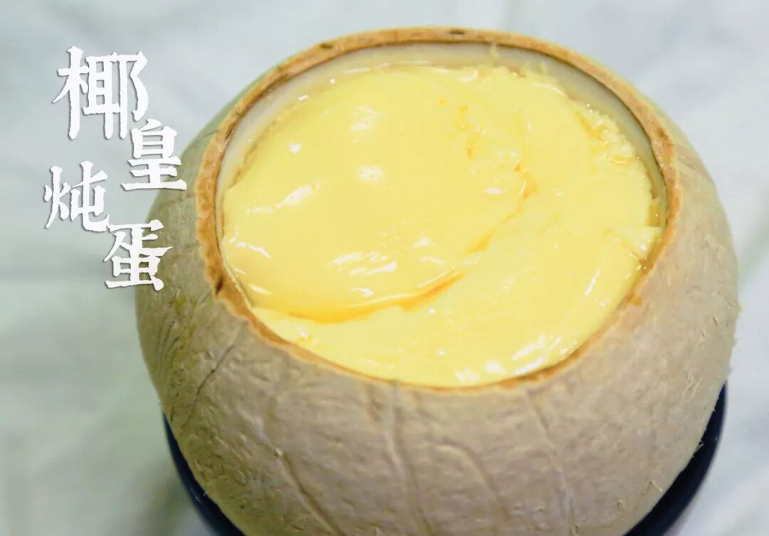 椰皇炖蛋,是入口即化的口感。浓郁的蛋味混合着淡淡椰香,鸡蛋变得非常嫩滑。椰壳内有一层乳白色椰肉,吃完炖蛋可以刮下来吃掉,很滋润。
