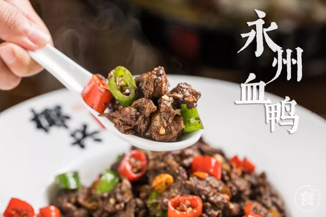 血鸭虽然外表不讨好,却是湖南的传统名菜之一。把小水鸭斩件切粒,用各种辣椒大火爆香,最后加入鸭血7成熟就出锅,香辣爽口,是下饭的好菜。