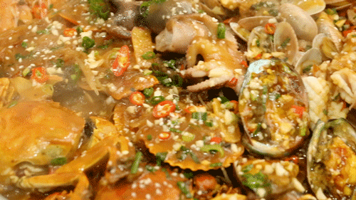 铺好时蔬,摆上海鲜,撒好酱汁和佐料,最后淋上了爆香的热油。“滋啦”一声,仿佛唤醒整盘海鲜,让它们开始咕噜沸腾,熟成上桌。