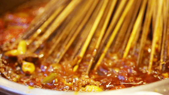 吸足了牛油辣锅的汁水后,搭配嫩滑的牛肉