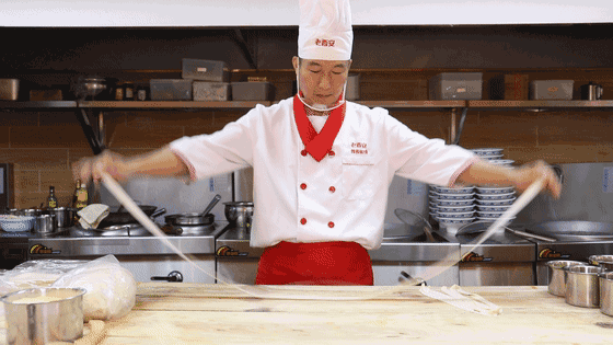 臊子面的面条也是要店里师傅每天现揉现擀,反复压制,才成就面条筋韧爽口的口感。