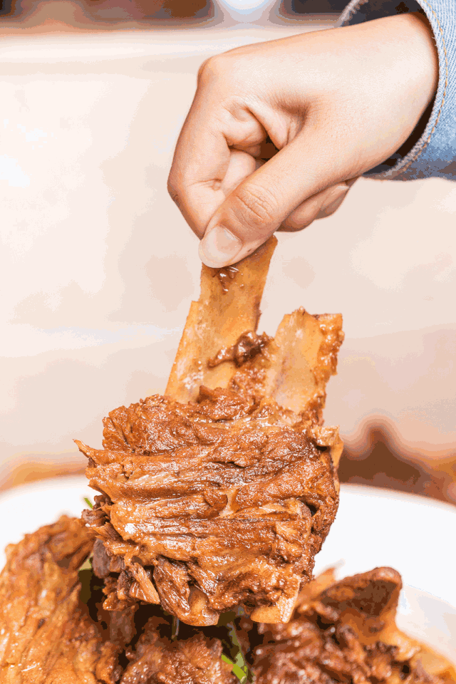 吃酱大骨时千万不要在乎形象,直接上手,大口啃肉才痛快。大骨肉质炖煮得很软嫩,连骨头缝隙中的小肉丝都超有滋味。