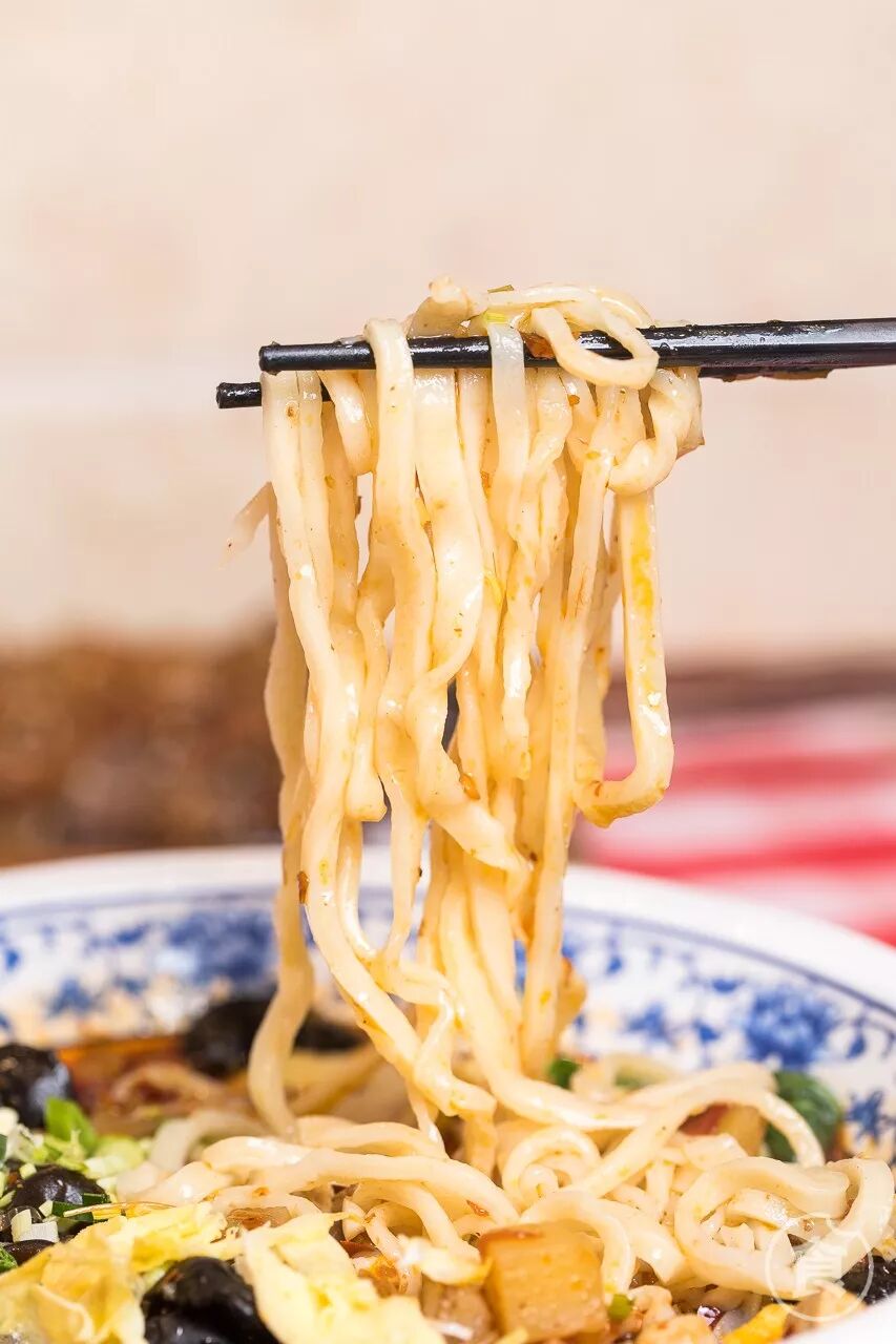 biangbiang面面条宽厚弹韧,酸辣爽口,很耐饥饿。陕西八大怪之一“面条宽得像裤带”形容就是这种面条。